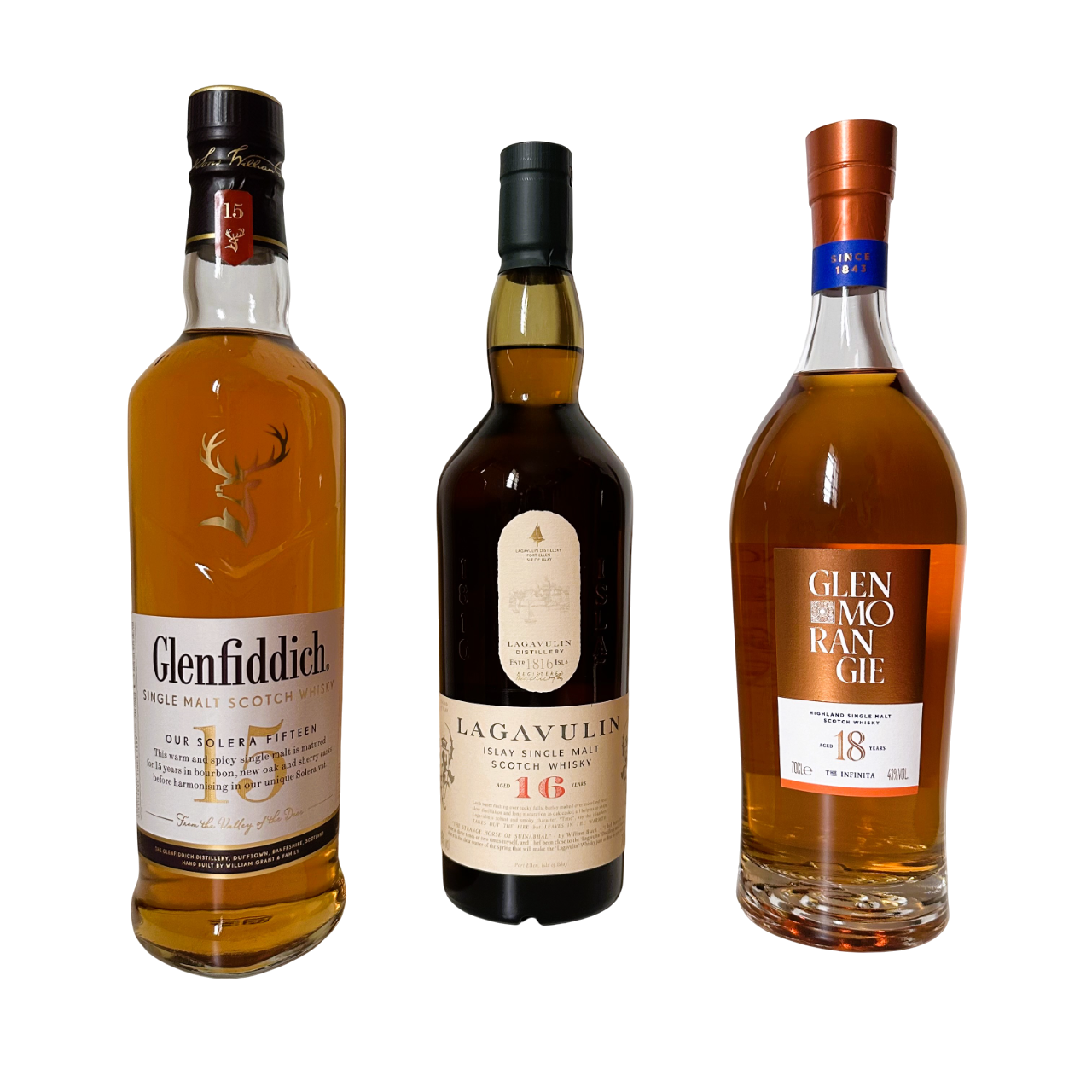 Aberlour, Ardbeg, Balvenie, Dalmore, Glenfiddich, Glenmorangie, Knockando, Lagavulin, Macallan